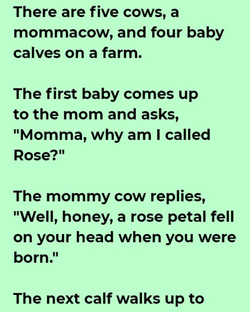 There are five cows, a momma cow, and four baby calves on a farm. The first baby comes up to the mom and asks, “Momma, why am I called Rose?”