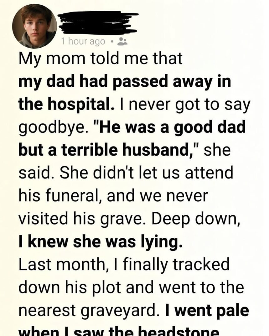 Maybe it was finally understanding how heavy adulthood can be. Or maybe it was watching my mom—older now, quieter—sit alone on the porch at dusk, holding memories she never put down. That night, I searched for my dad’s burial records.