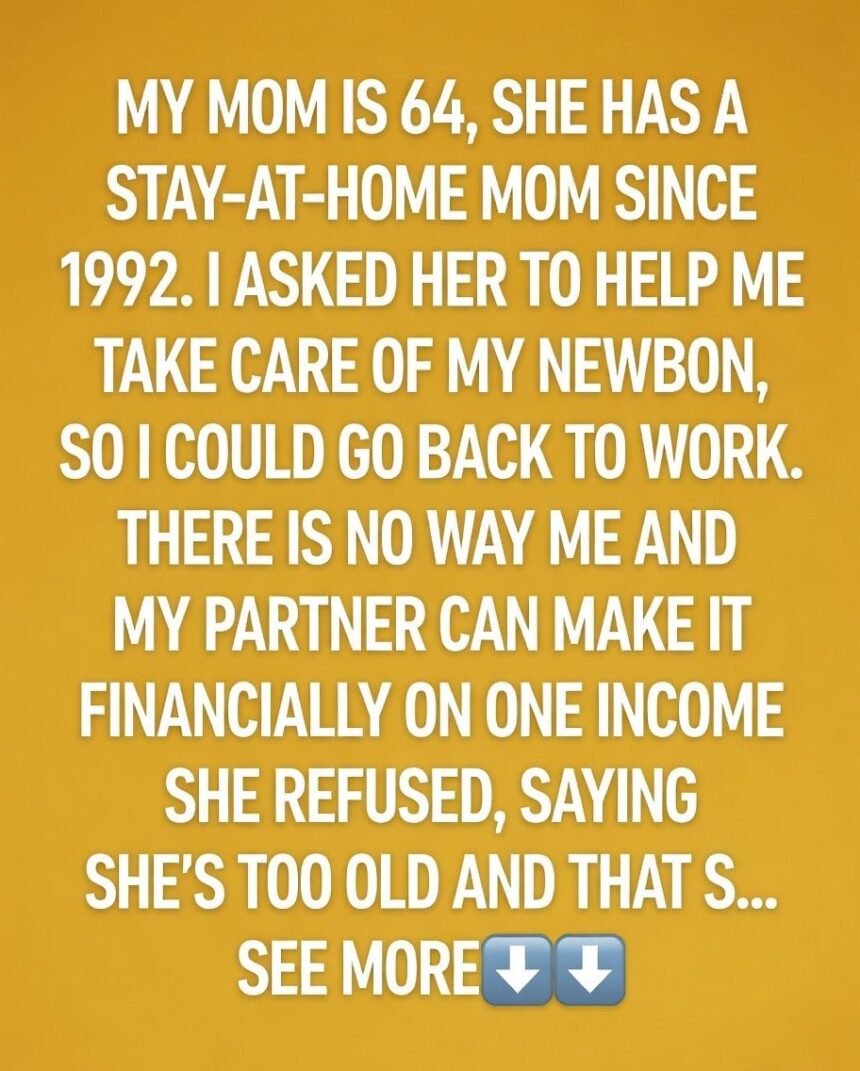 A woman asked her 64-year-old mother—who has been a stay-at-home mom since 1992—to care for her newborn so she could return to work. But the grandmother declined, saying she had already raised her children and now wanted to enjoy her own time.