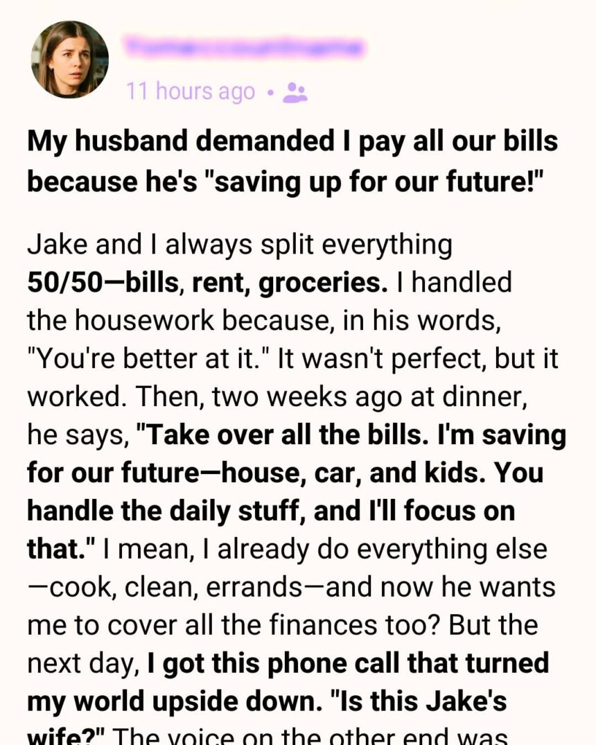 It all began with a strange request over dinner—one that didn’t quite make sense at the time. But the phone call that came just days later was what truly shattered everything I believed about my husband. My husband, Jake, and I had always seen ourselves as modern and fair.