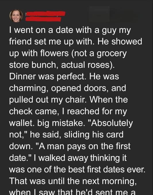He insisted on paying for everything, smiling as he said, “A man pays on the first date.” I thanked him, a little impressed by his confidence and manners. The conversation was decent, and while there weren’t fireworks, he seemed sweet and respectful. That night, I went to bed feeling hopeful.