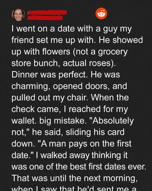 He opened doors, pulled out my chair, and kept the conversation engaging throughout dinner. By the end of the night, I genuinely believed I’d met a true gentleman. When the bill arrived, he firmly insisted on paying, saying, “A man covers the first date.” His tone surprised me slightly, but I let it go and thanked him.
