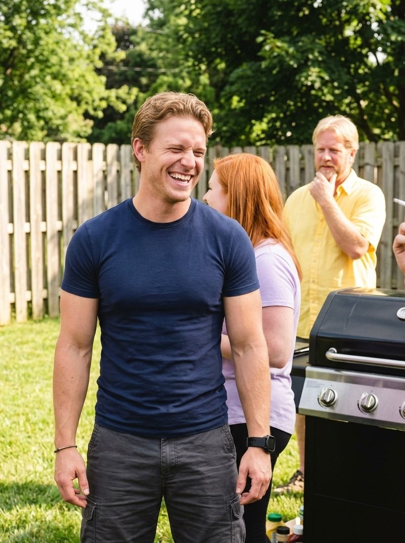 Country music was blaring from the patio speakers, competing with the rockous laughter of men holding cans of Bud Light. And in the center of it all, standing by the grill like he had just conquered a nation, was Kyle.