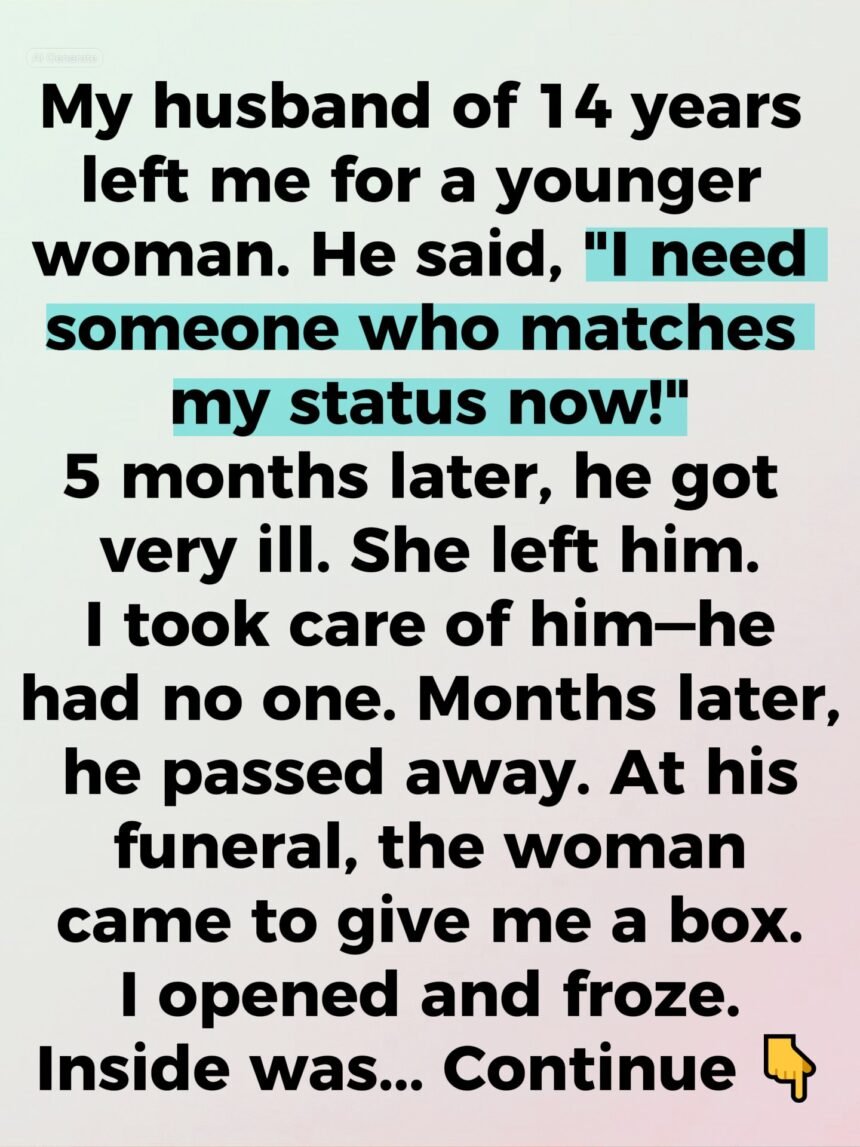My husband of fourteen years left me without warning — traded in our quiet, familiar life for a younger woman who made him feel powerful again. His last words to me as he packed his suitcase cut deeper than any blade: “I need someone who matches my status now.”