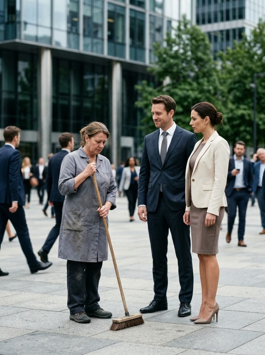 He smirked when he saw me sweeping outside his dream office tower. His fiancée laughed, called me pathetic, and he told me I didn’t belong there. What they didn’t know was that in thirty minutes, they would walk into a boardroom and learn the woman they mocked owned the entire building.