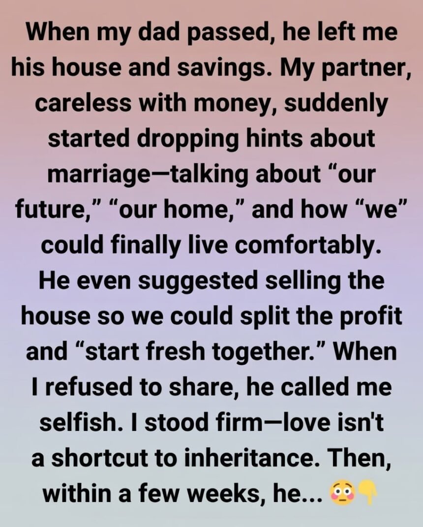 When your dad passed away, you were already navigating something incredibly heavy—grief mixed with responsibility. Being left his house and savings wasn’t just financial support; it was a final act of care, a way of making sure you’d be okay. The shift in your partner’s behavior right after that wasn’t subtle—it was telling.