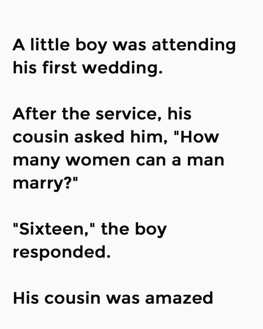 A little boy was attending his first wedding. After the service, his cousin asked him, “How many women can a man marry?”