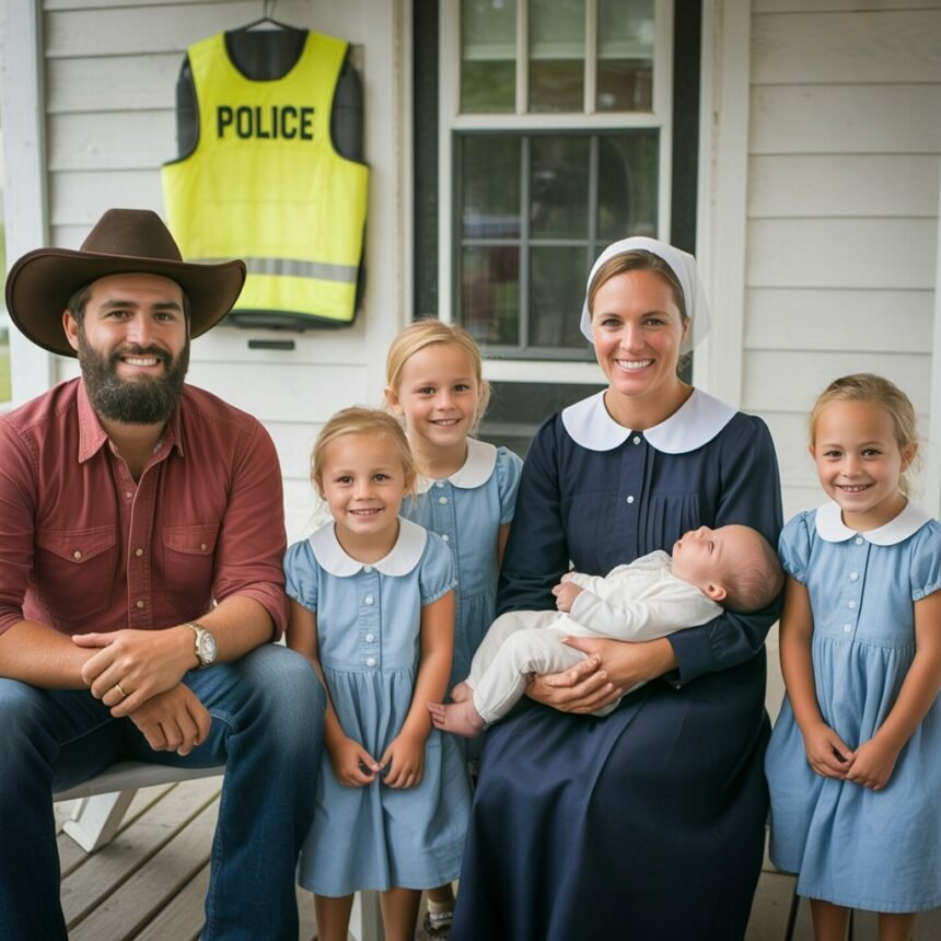The mother, in a plain dress and prayer cap, holds an infant. Four children arranged by height, all looking directly at the camera with the serious expressions common in Amish photography. It’s the kind of photo that exists in thousands of farming communities across America—a simple documentation of a harvest season, a family moment, nothing more.