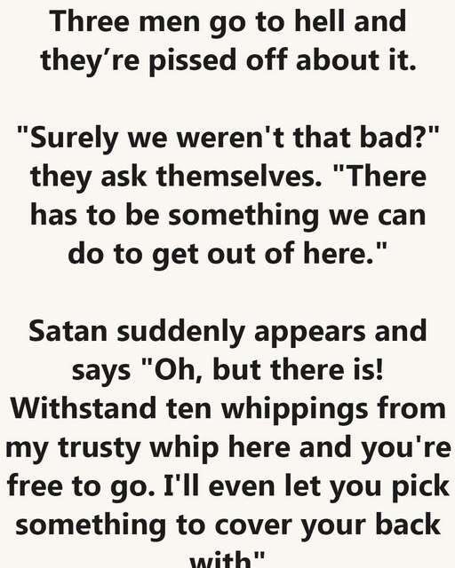 Three men go to hell and they’re pissed off about it. “Surely we weren’t that bad?” they ask themselves. “There has to be something we can do to get out of here.”