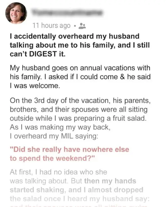 However, her in-laws had an annual family vacation, and this year she asked her husband if she could join.