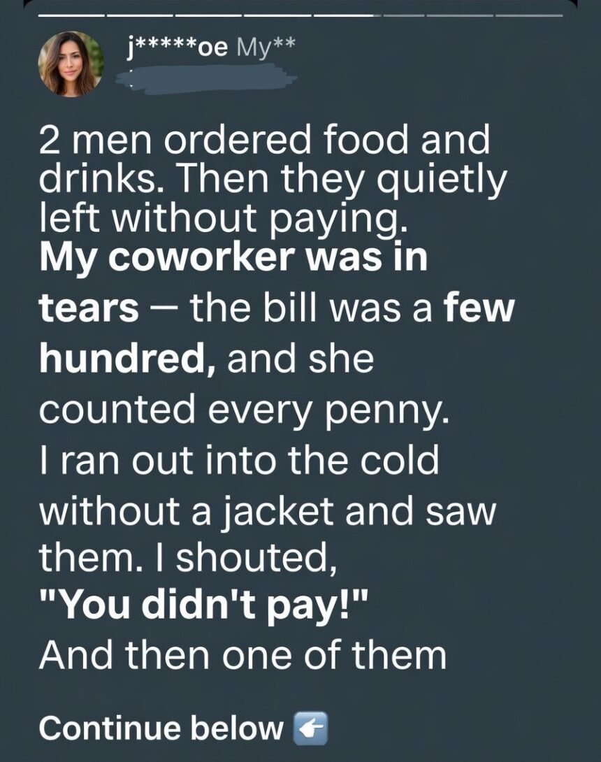 Two men ordered food and drinks. Then they quietly left without paying. My coworker was in tears the bill was a few hundred dollars, and she counted every penny, knowing she couldn’t afford to cover it herself.