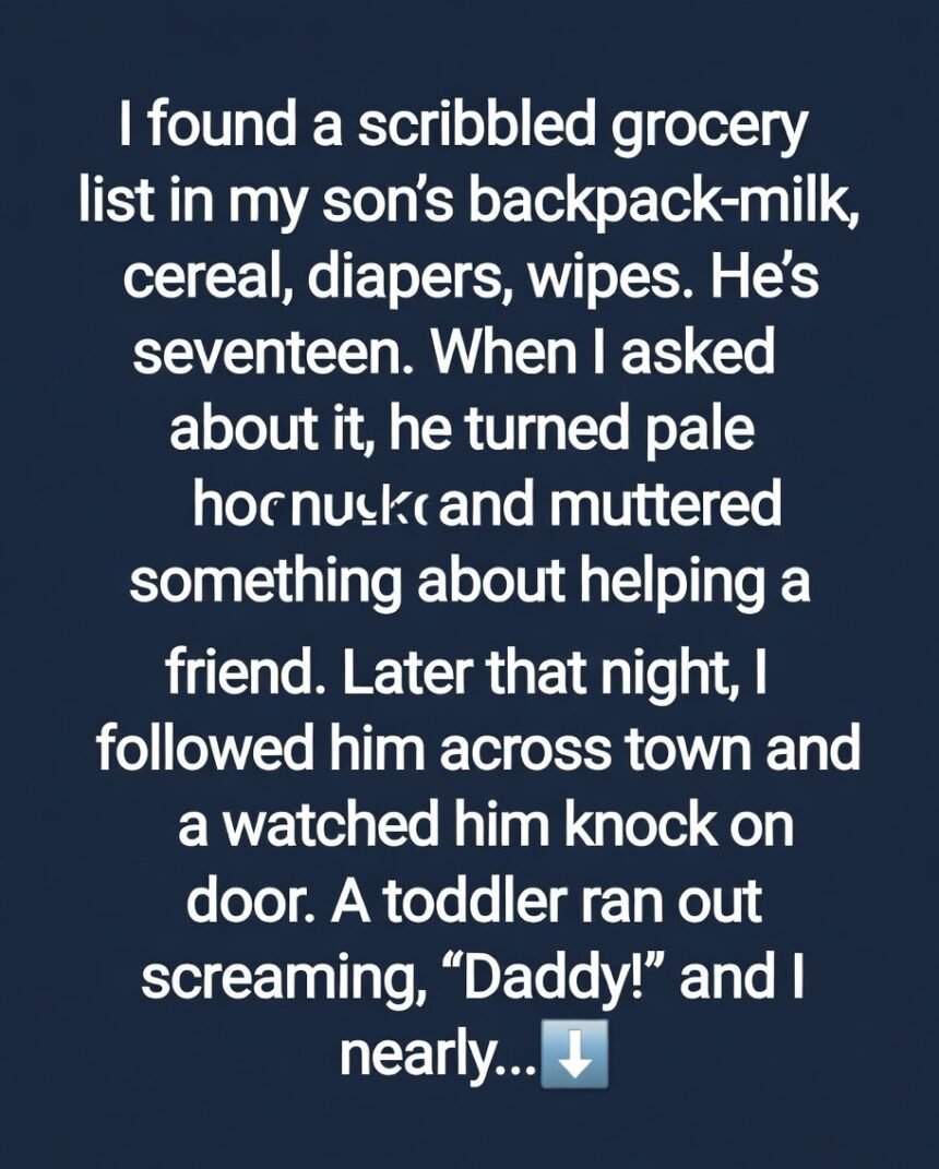 I found a scribbled grocery list in my son’s backpack—milk, cereal, diapers, wipes. He’s seventeen. When I asked about it, he turned pale and muttered something about helping a friend.