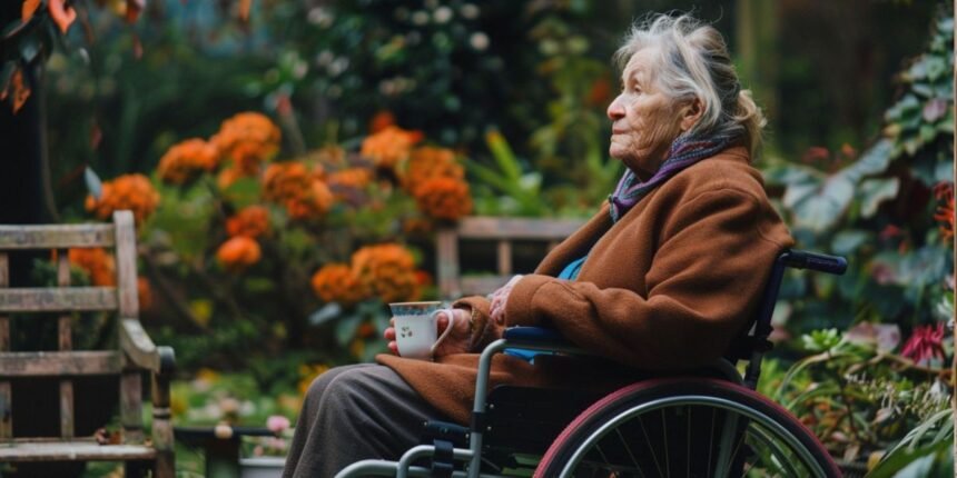 This skinny old woman, maybe 80, slumped in a beat-up wheelchair.