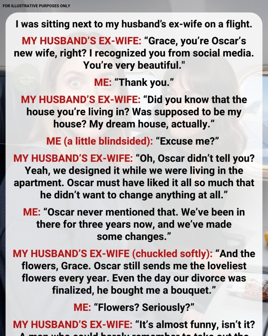 “Thank you,” I replied, my voice thinner than I intended. It hit me then: this was the woman my husband once vowed to spend his entire life with. Sitting next to her felt like sharing a row with a ghost—a piece of his past I never expected to meet, much less be trapped beside for the next three hours.