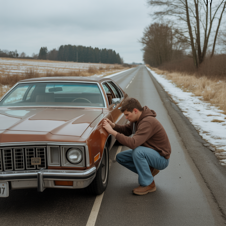 The road looked dusted with sugar. Then I noticed an old sedan on the shoulder, tires flat, wind whipping through thin jackets. An elderly couple stood beside it.