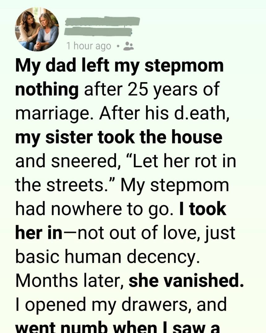 “I’ll be gone as soon as I figure something out.” I told her to stop worrying, but she never really did. For months, we lived quietly under the same roof. She cooked simple meals and cleaned up after herself immediately, as if afraid of taking up space.