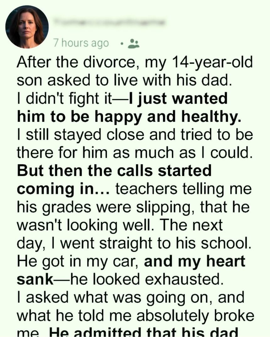 When my 14-year-old son, Mason, asked to live with his dad after the divorce, I agreed. Not because I wanted to—truthfully, I would have kept him with me every day if I could—but because I didn’t want to stand in the way of a father and son trying to reconnect. I still had weekends with him and could see him whenever he wanted.