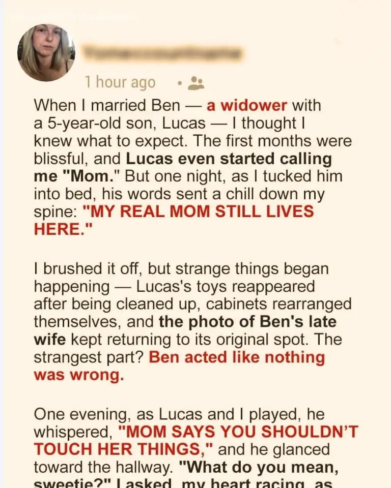 “My real mom still lives here,” my stepson whispered one night. I laughed it off, until I started noticing strange things around our home.