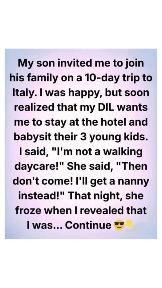 I’m Joyce, a 68-year-old retired widow. My son invited me on a 10-day family trip to Italy this September, and at first I was thrilled—thinking it would be a chance to make memories together. But I quickly realized my daughter-in-law expected me to stay in the hotel the whole time, babysitting their three young kids.