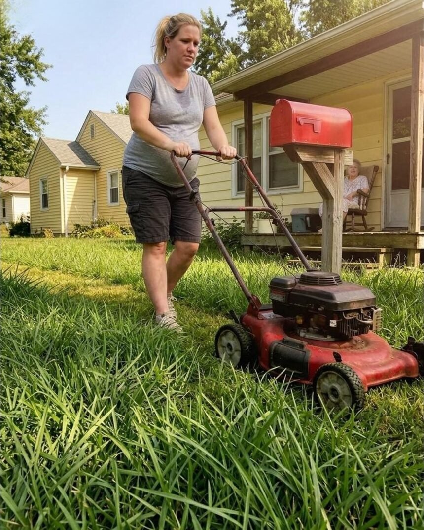 Higgins, struggling to push a lawn mower beneath the blazing summer sun. Though exhausted and overwhelmed myself, I couldn’t walk away. I offered to help, and despite my swollen feet and aching back, I finished mowing her entire lawn while she watched from the porch with grateful eyes.