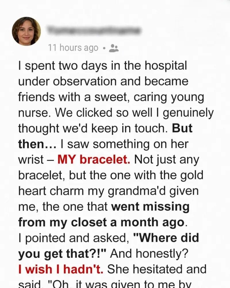 The moment I spotted the delicate gold bracelet on Nurse Stephanie’s wrist, my heart stopped. It was my grandmother’s gift, engraved with a tiny smiley face — the one I had searched for endlessly before accepting it was gone. Seeing it glint under the hospital lights was surreal.When I asked about it, Stephanie smiled and said her boyfriend had given it to her a month ago — the same time mine disappeared.