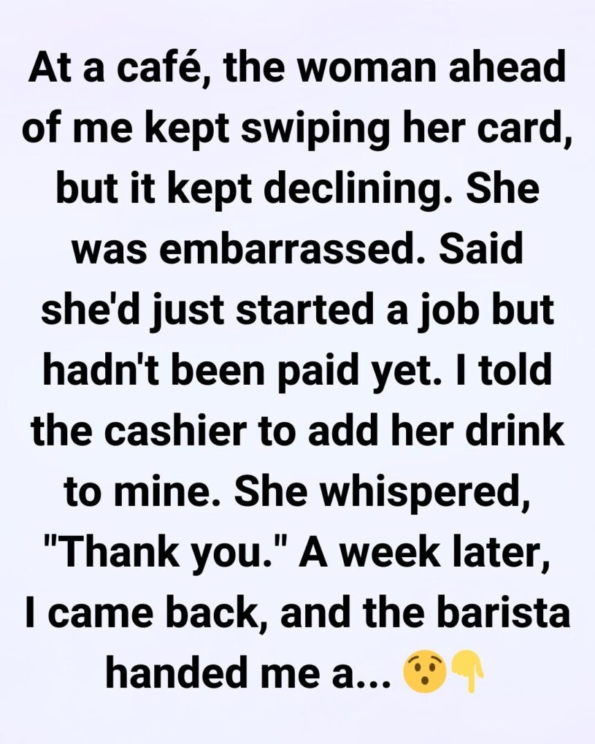 “This one’s on the house,” she said. I must’ve looked confused, because she slid a little yellow sticky note across the counter. On it, in neat handwriting, were five simple words: From the woman you helped.