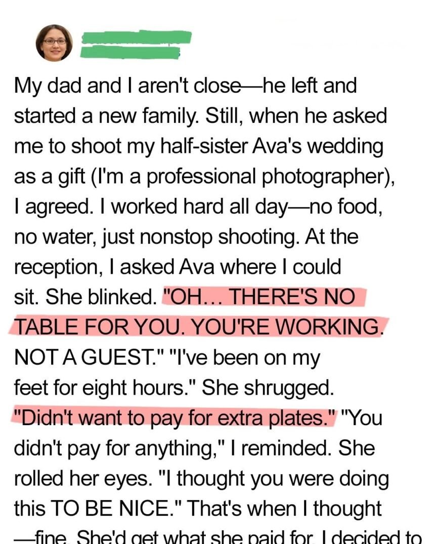 When my half-sister Ava asked me to photograph her wedding for free, I hesitated. We barely knew each other—our connection existed only through our father, who left my mom when I was three and started a new family. Still, hoping to be the bigger person, I agreed on one condition: I’d be treated like family, not just the help.