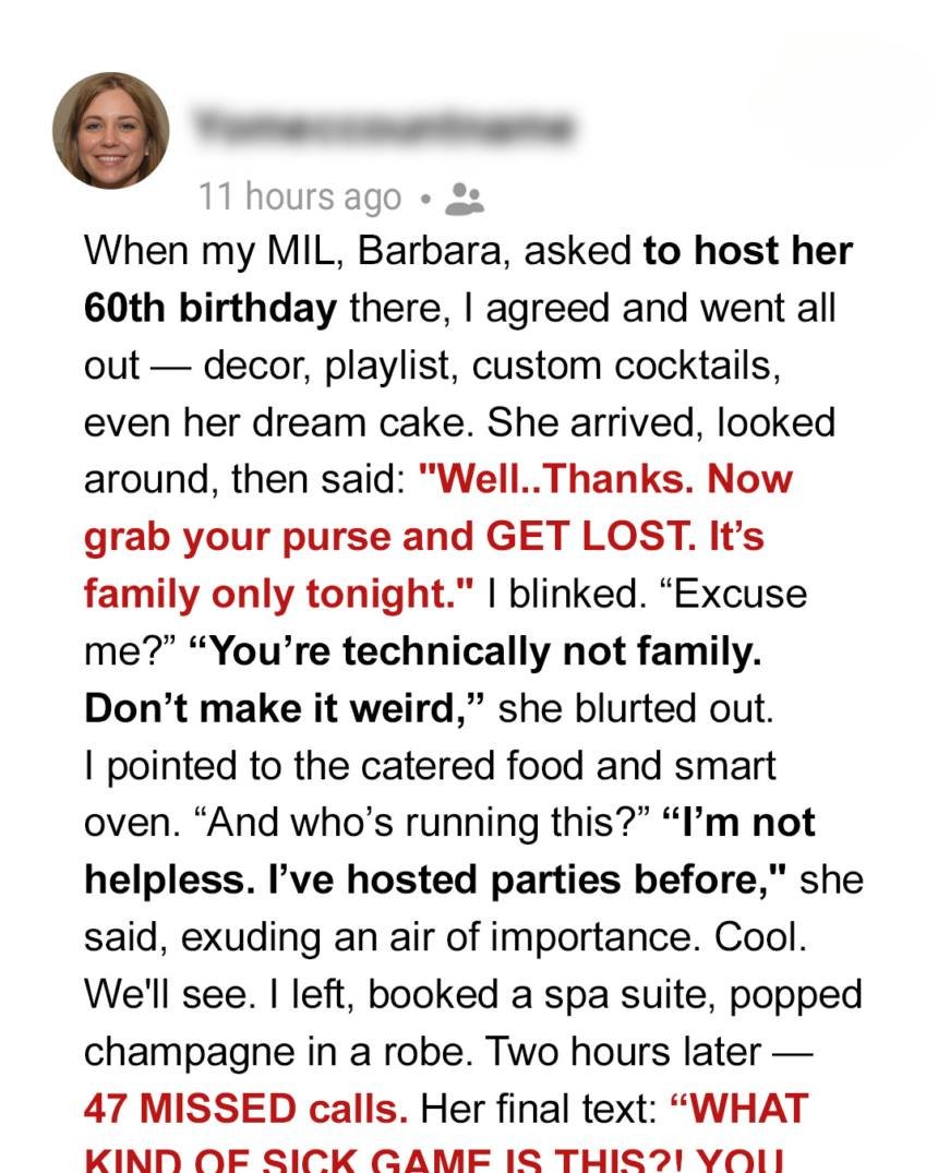 Though he resisted, the pressure made him give in, and I snapped — leaving the party in tears. At home, Bill confronted me for leaving without a word, but when I asked why he went along with it, he said he didn’t want to upset his mom on her birthday. That only made the betrayal sting more.
