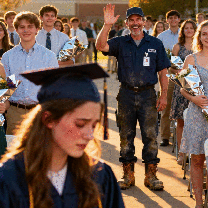 I saw him the second I scanned the crowd. Everyone else was dressed in neat button-downs and summer dresses, holding bouquets wrapped in shiny paper. And there he was—standing near the back, work boots scuffed, navy-blue uniform creased from a long shift, ID badge still clipped to his chest.