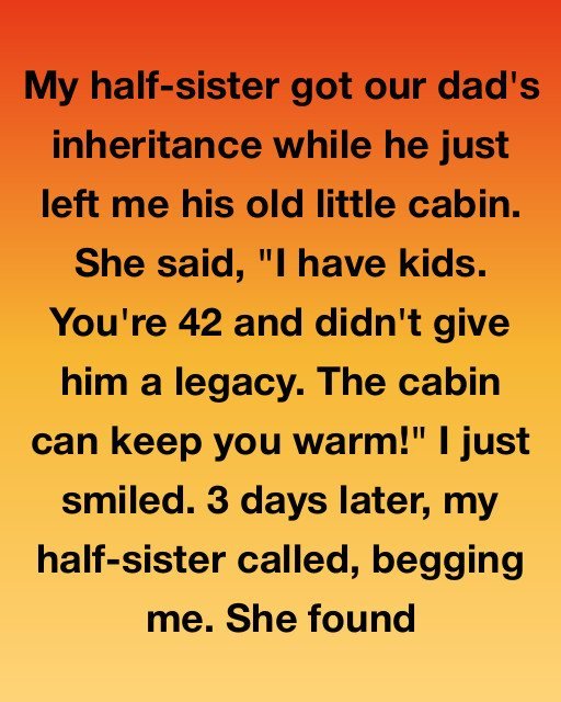 My half-sister got our dad’s inheritance while he just left me his old little cabin. It was a brutal reading of the will in a stuffy office in Leeds, where the air felt thick with a decade of unspoken resentment. Dad’s estate wasn’t massive, but it included his main house, his savings, and a respectable life insurance policy.