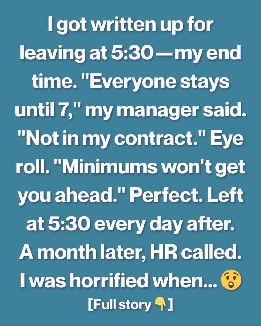 When I walked into the room, my manager was already there, wearing a smug expression, as if she’d finally caught me doing something wrong. But then HR said, “We’ve been reviewing the timesheets. Writing you up for leaving on time goes against company policy and your contract.