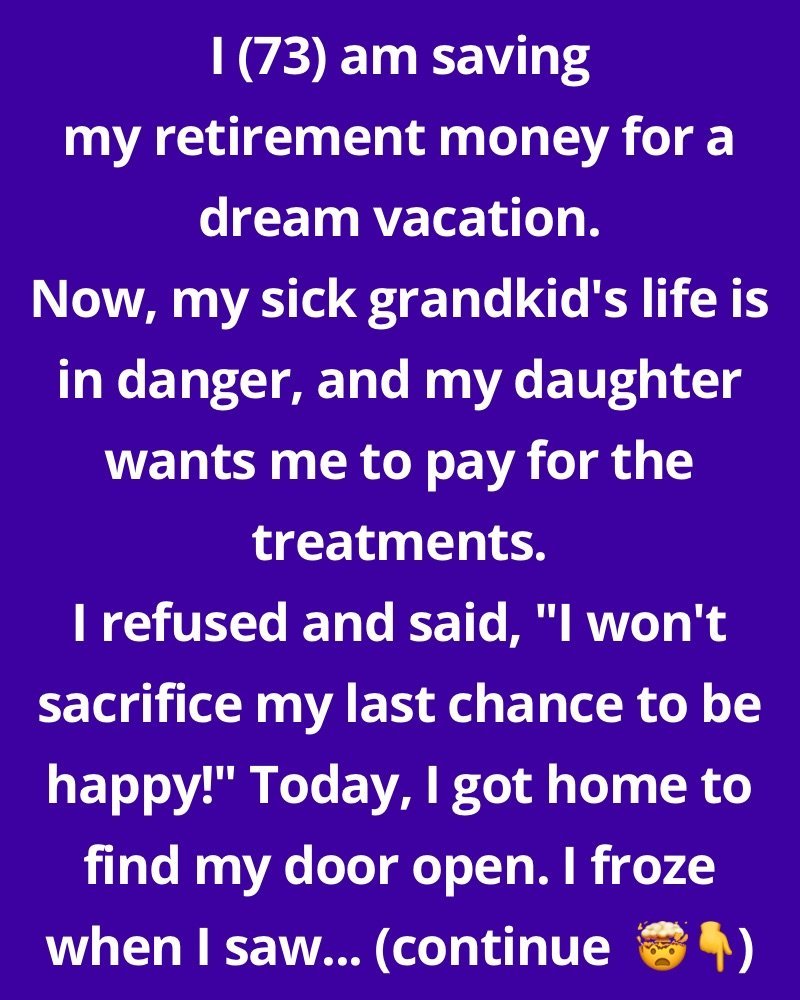 I’m 73 and have been putting aside my retirement funds for a long-desired vacation. Now, my ill grandchild’s life hangs in the balance, and my daughter is urging me to cover the medical costs. I turned her down, saying, “I can’t give up my last chance for happiness!”
