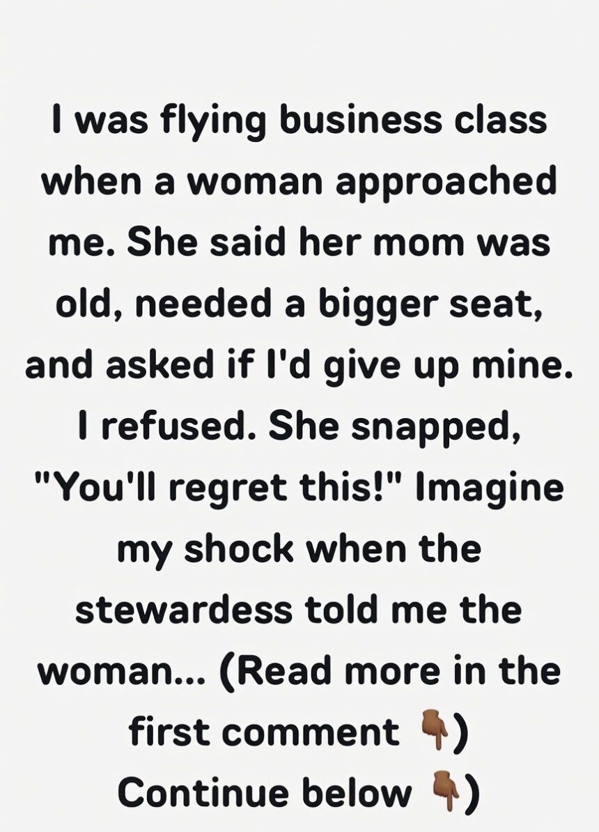 So I was on a long-haul flight recently, sitting pretty comfy in business class, first time I’ve splurged like that, honestly. About 20 minutes after boarding, this woman comes up to me and asks if I could give up my seat for her “elderly mom” because she “needs more space,” like a bigger seat. I was caught off guard but politely said no, like, I paid for this seat, I’m not about to squeeze into economy for 12 hours.
