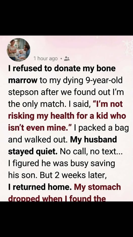 I said no to saving my nine-year-old stepson, Leo. For three years, he had been part of my life—breakfast at my table, Saturday night movies, falling asleep on my shoulder. But when doctors said I was his only bone marrow match, I refused.