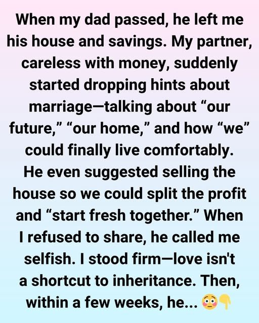 When my dad passed away last year, he left me his house and some savings. It was bittersweet — I was heartbroken over losing him, yet deeply grateful that he’d made sure I would be okay. My partner of three years (32M) had always been somewhat careless with money, but the moment he found out about the inheritance, his entire attitude shifted.