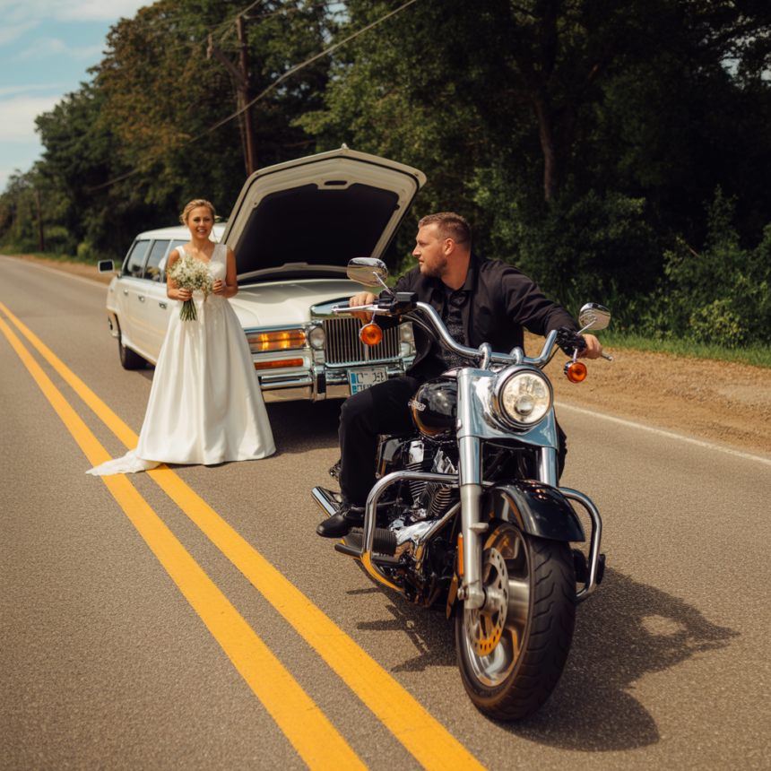 I thought the biker was going to kidnap me but what he did made everyone cry. He pulled over next to my broken down limousine on that empty Texas road. I was standing there in my wedding dress, mascara running down my face, thirty minutes away from the church where 200 guests were waiting, and this massive man on a Harley rolled up like something out of a nightmare.