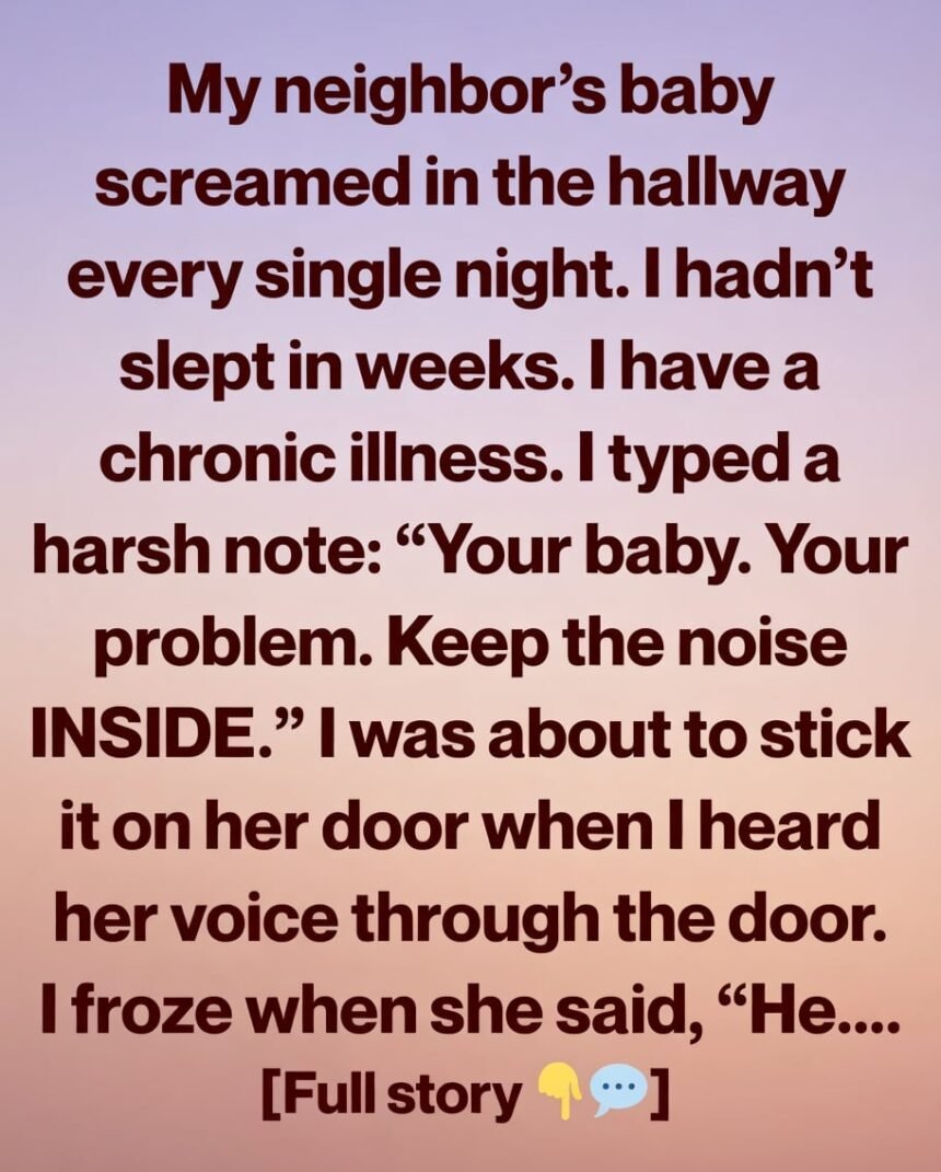 For weeks, my nights were shattered by the same relentless sound—a baby crying in the hallway outside my apartment. Not the kind of crying that fades quickly, but the desperate, exhausted wail that seeps into your bones and refuses to let go. I hadn’t slept properly in days, and with my chronic illness, the exhaustion wasn’t just frustrating—it was debilitating.