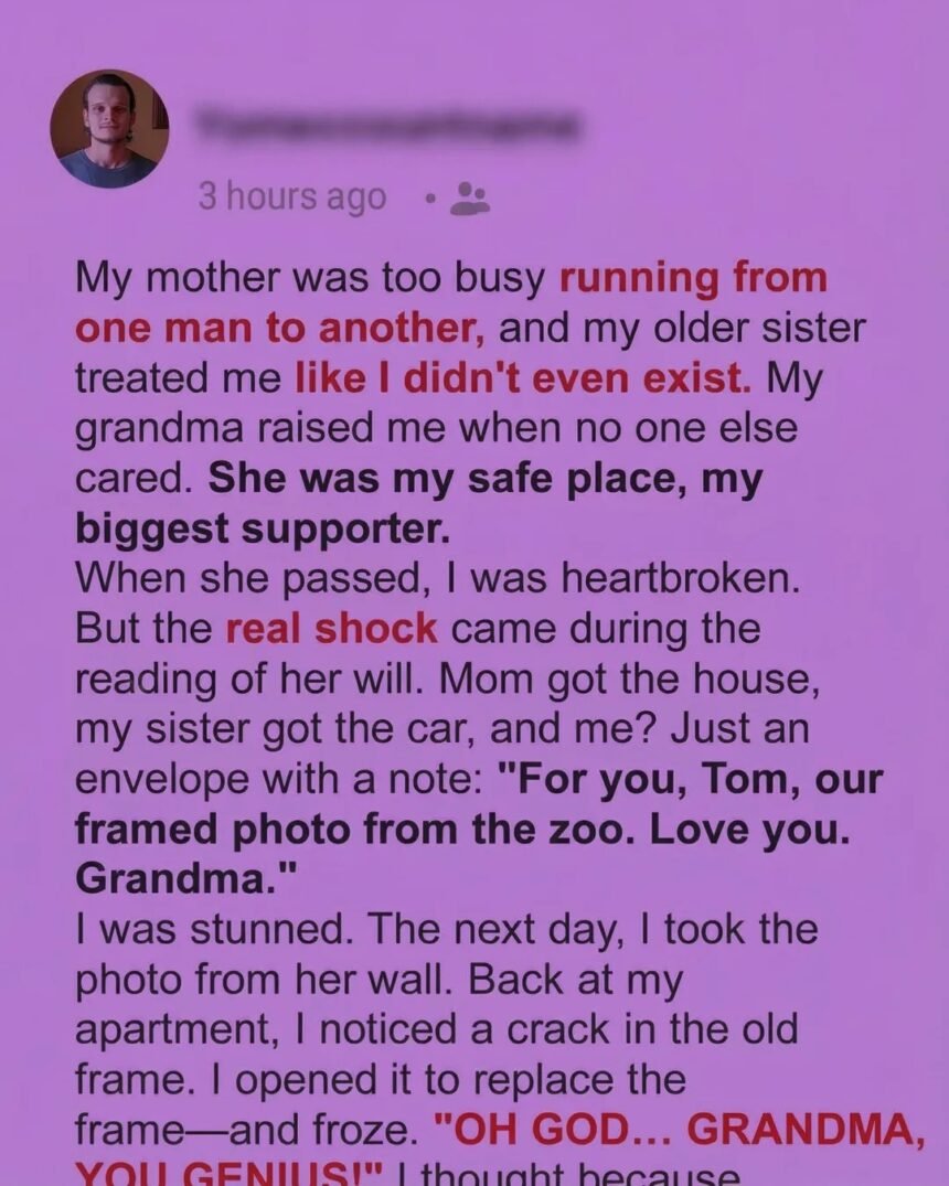 “For you, Tom, our framed photo from the zoo. Love you. Grandma.” I sat there stunned, trying to smile politely while my chest tightened.