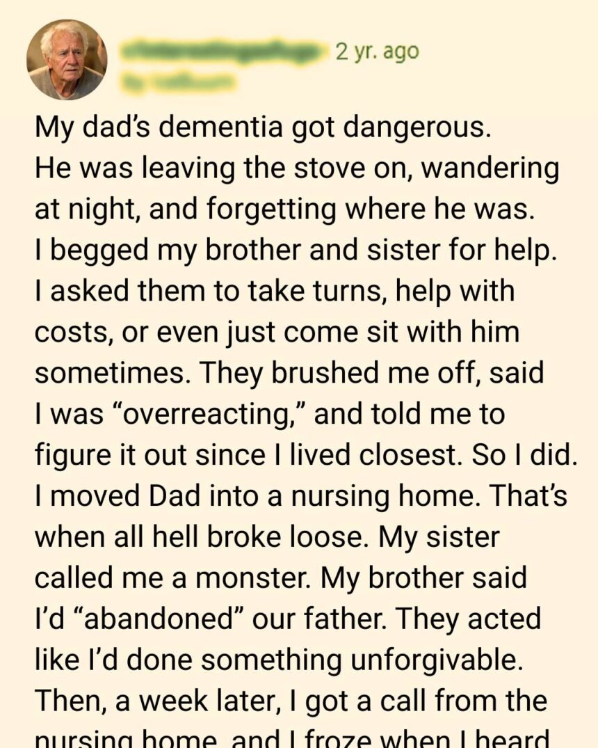 My sister screamed that I was a monster. My brother said I’d “abandoned” our father like unwanted baggage. They talked about loyalty and family as if I hadn’t been the one cleaning up burned pans and answering midnight phone calls.