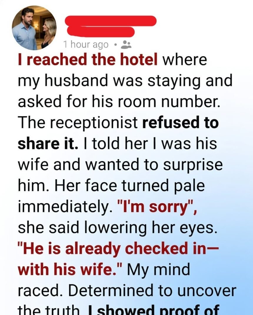 It wasn’t proof, but it was enough to shatter the comfort I had been clinging to. I booked a flight without telling him. At the hotel, I asked for his room number, pretending everything was normal.
