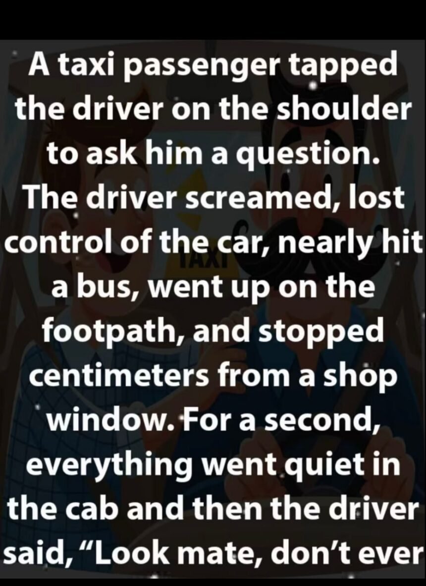 Didn’t see that coming! A taxi passenger tapped the driver on the shoulder to ask him a question. The driver screamed, lost control of the car, nearly hit a bus, went up on the footpath, and stopped centimeters from a shop window.