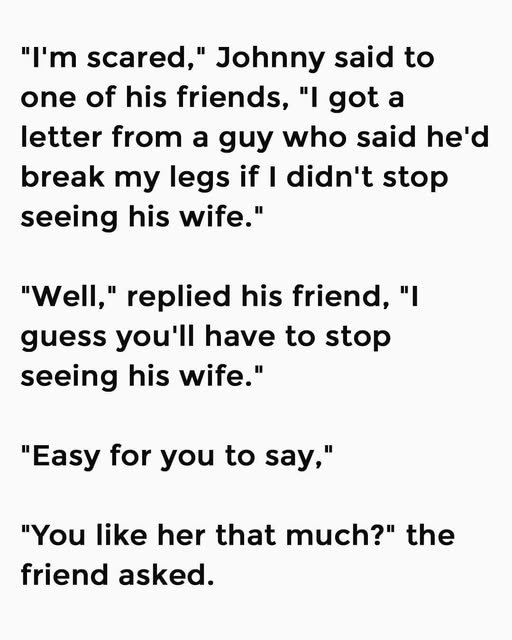 “I’m scared,” Johnny said to one of his friends, “I got a letter from a guy who said he’d break my legs if I didn’t stop seeing his wife.”