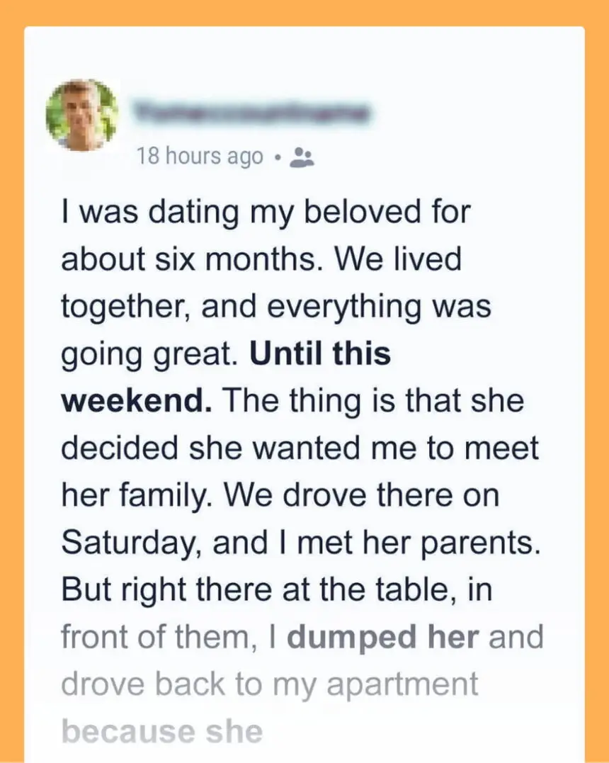 In his Reddit post, the man sought opinions from the online community, specifically asking if he was in the wrong for ending the relationship in front of her parents.