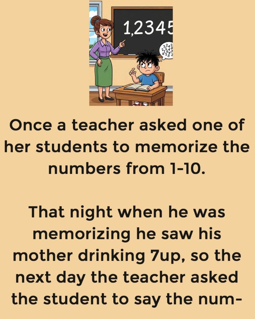 Once a teacher asked one of her students to memorize the numbers from 1-10. That night when he was memorizing he saw his mother drinking 7up, so the next day the teacher asked the student to say the numbers that he memorized he replied,” 1-2-3-4-5-6-8-9-10″. The teacher was confused so she asked the student,” Where is the 7″ he said,” my mom drank it last night!”