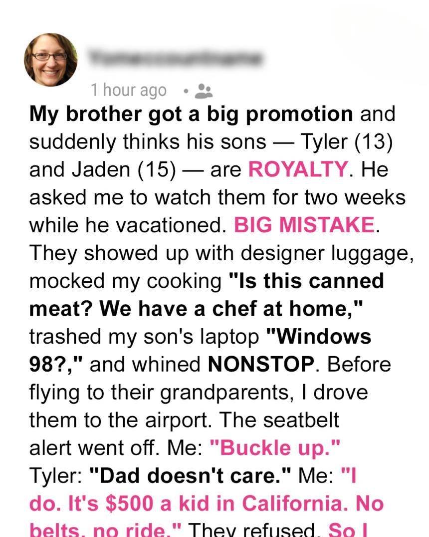 When my brother asked me to watch his two sons while he and his wife went on vacation, I agreed — even though something in me knew it wouldn’t be easy.From the moment they arrived, it was clear they weren’t used to a modest home like mine. They turned up with designer luggage, scoffed at homemade spaghetti, and compared everything in my house to the luxuries they had back home — from our fridge to my son Adrian’s gaming laptop. Adrian tried to be welcoming, offering cookies, games, and even showing his Lego collection, but they brushed him off every time.