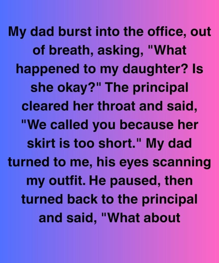 “My dad burst into the office, out of breath, asking, ‘What happened to my daughter? Is she okay?’ The principal cleared her throat and said, ‘We called you because her skirt is too short.’ My dad turned to me, his eyes scanning my outfit. He paused, then turned back to the principal and said, ‘What about your dress code policy for teachers?’”