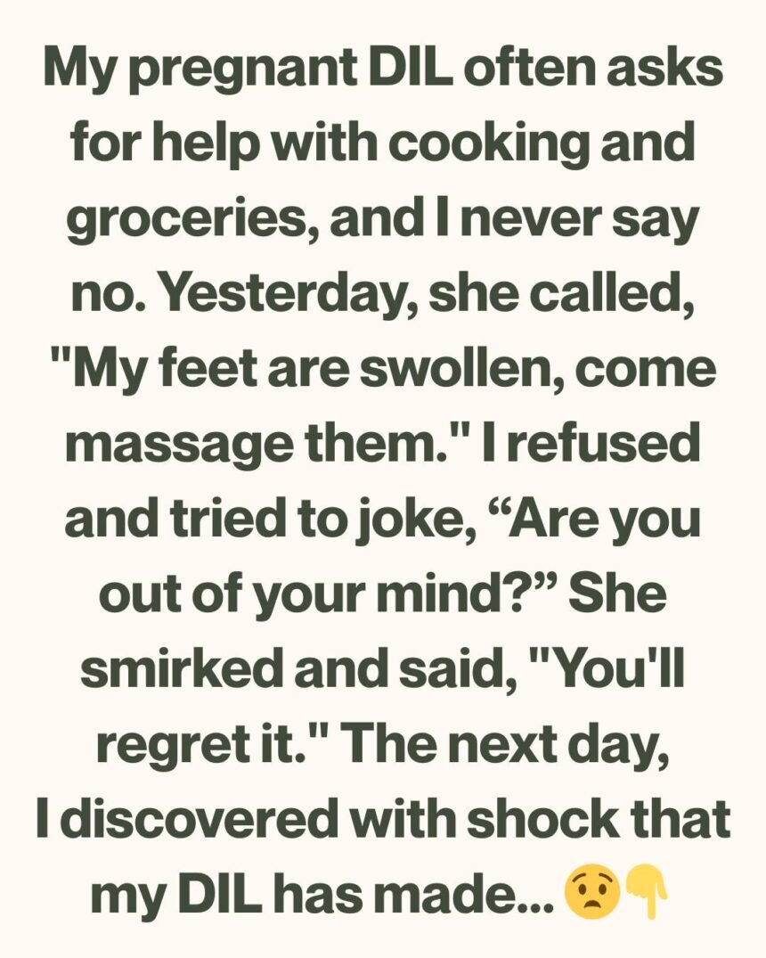 And then I learned the part that makes my stomach twist: she’s been secretly filming me for weeks. Normal, everyday interactions—me sitting quietly, me looking tired, me declining an unnecessary errand—and cutting them into little moments to make me seem cold, aloof, uncaring. She was building this narrative long before the foot-massage incident.