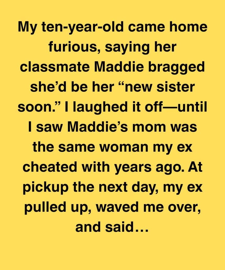 My ten-year-old came home furious—her classmate Maddie said she’d be her “new sister soon.” I laughed, until I saw Maddie’s mom was the woman my ex cheated with while I was pregnant. The next day at pickup, my ex waved me over. “So, uh… we should talk,” he said, scratching his neck like he used to when he was lying.