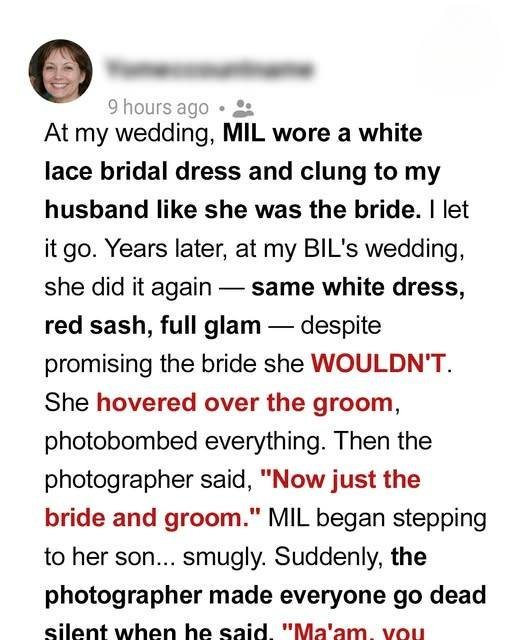 At my wedding, my mother-in-law, Linda, showed up late wearing a full-length white lace gown and stayed glued to my groom like she was the bride. It was shocking, but I decided to let it go.Years later, my brother-in-law Dylan got engaged to the sweetest woman, Sarah. I warned Sarah about Linda’s past behavior, but she assured me Linda had promised to respect the dress code.