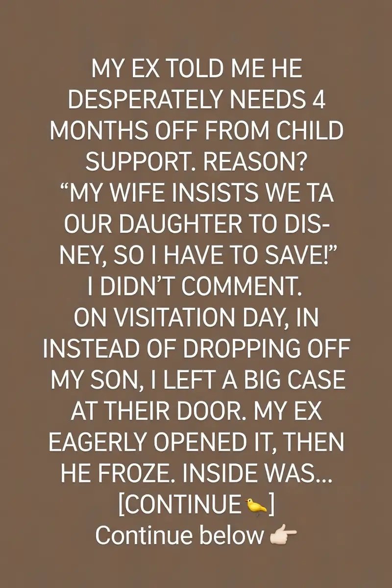 My ex-husband called me one evening with a request that left me speechless.He said, “I really need four months off from child support. My wife insists we take our daughter to Disney, and I have to save for the trip!”I couldn’t believe what I was hearing — our son’s well-being was being compared to a vacation.Instead of arguing, I calmly replied, “Okay,” and ended the call.That night, I decided to show him the reality he had been ignoring. On visitation day, he expected me to drop off our son as usual.Instead, I carried a large, heavy case to his doorstep.He opened the door with excitement, thinking it was filled with toys or something fun for his daughter.But when he unlatched the case and looked inside, his smile vanished instantly.He stood there frozen, completely silent.